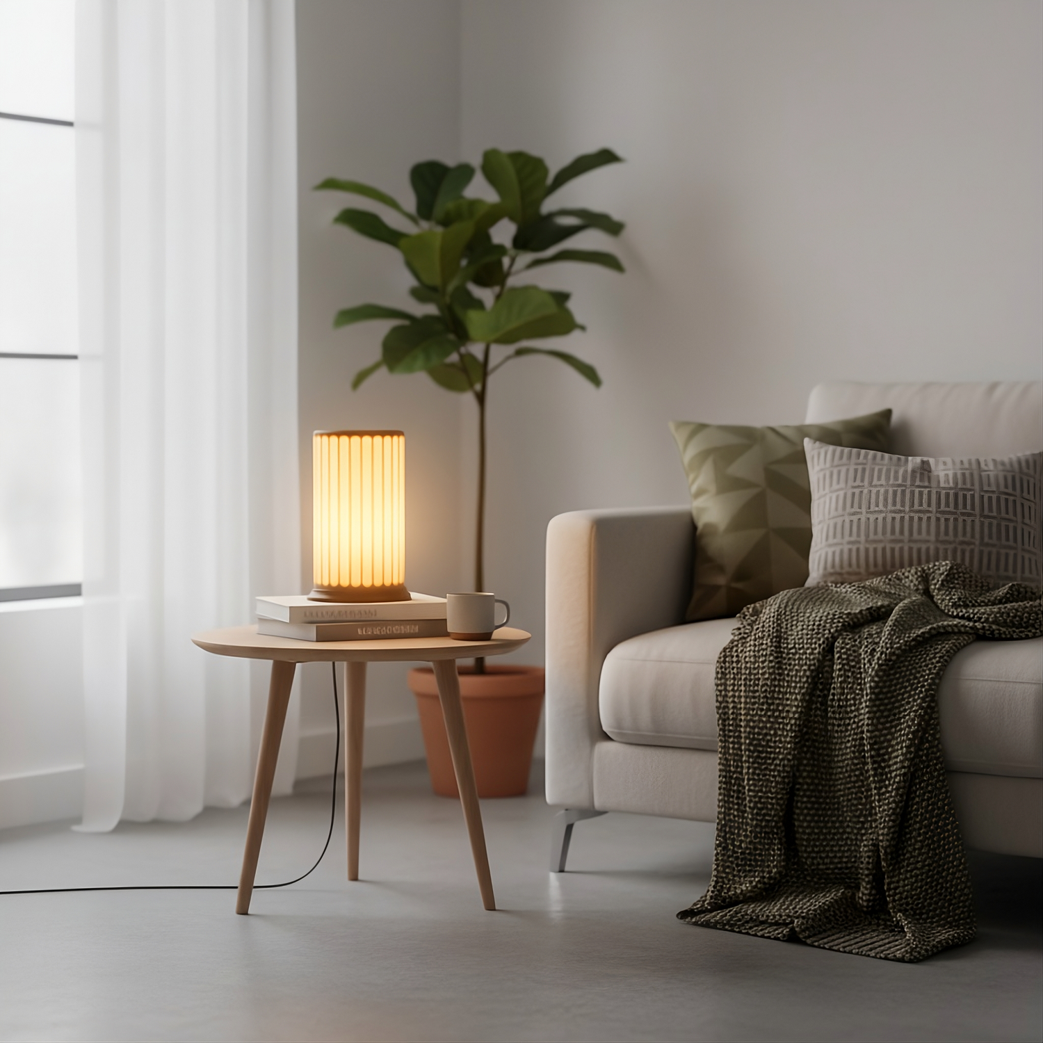 Lasciati avvolgere dalla luce morbida che filtra attraverso le lamelle verticali, evocando la delicatezza della seta. Il piedistallo nero opaco, scolpito con precisione, invita al tatto, mentre la luce calda del diffusore crea un'atmosfera di pura accoglienza. Un oggetto unico, pensato per chi cerca l'armonia tra forma e funzione.
